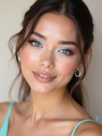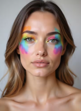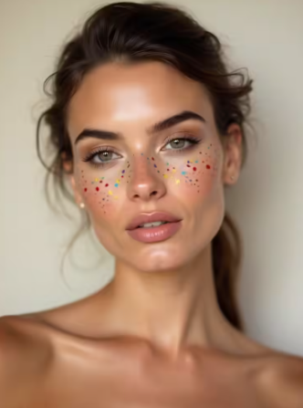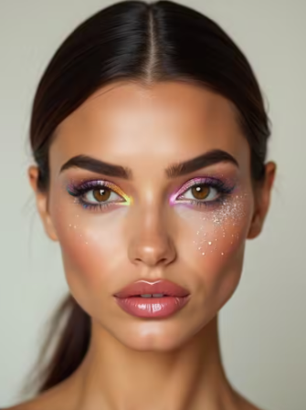 A small touch of highlighter completes the glow. The finish looks playful and blended, not patchy.