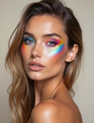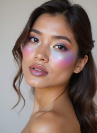 Add a rainbow-reflect highlighter across cheekbones and nose for a subtle color shift. The skin should look radiant and joyful.