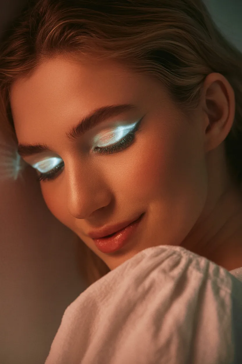 Apply a liquid or cream shadow and blend it out softly. Add a little gloss or shimmer for extra shine.
