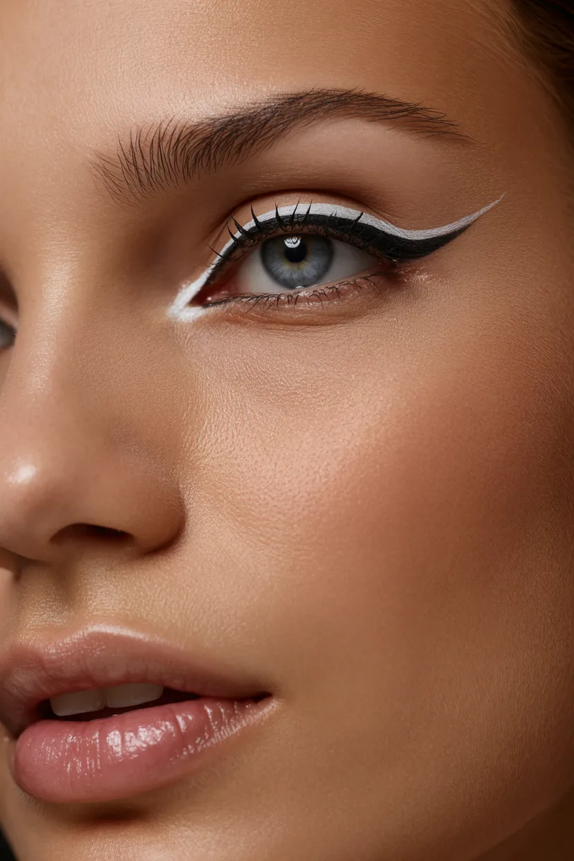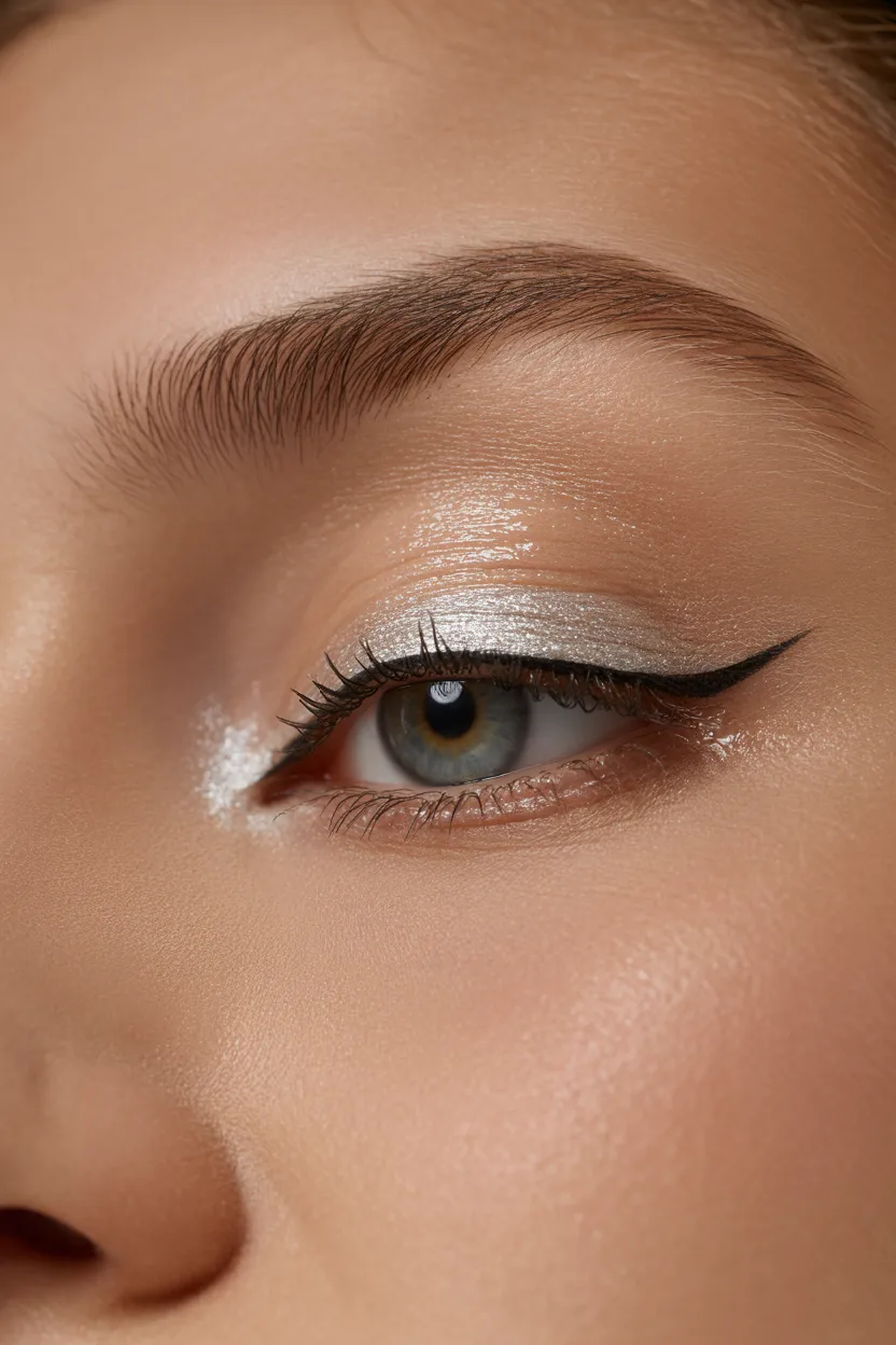 Creative makeup look with bold silver graphic liner, minimalist skin, modern artistic vibe, Pinterest style.